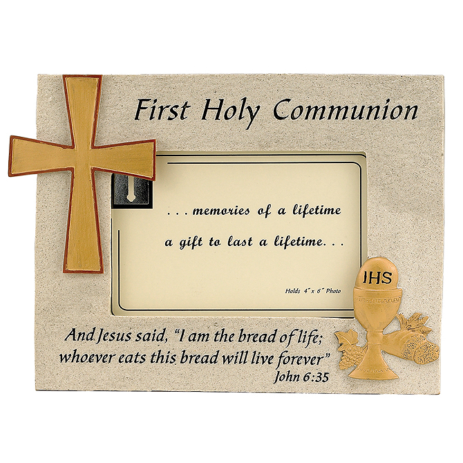 First Holy Communion Photo Frame. 6-3/4" High x 8-3/4" Wide. Made of Resin. Holds 4" x 6" photo.