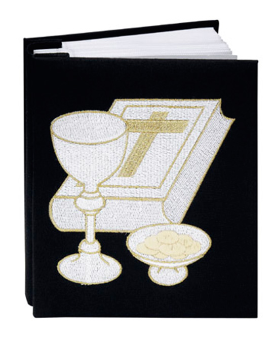 Elegant black broadcloth fabric covered photo album with gold embroidery. Includes a commemorative holy Communion certificate 4" x 5".