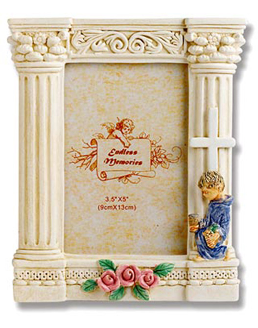 Polyresin First Communion Photo Frame, with kneeling communion boy 5-1/4" x 6-1/4".