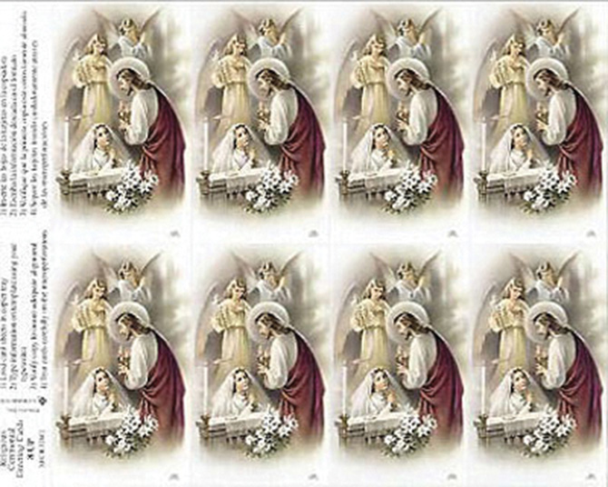 Full color paper holy cards on a sheet with custom imprint of your choice on back.. Micro-perforated to easily detach. Submit by fax or email the message or prayer you want to be printed on the back of the cards. A proof of the exact text will be provided for your approval and signature. 8 cards per sheet. Minimum amount to imprint 3 sheets or 24 holy cards. 8-1/2" x 10", individual card size 2 1/2" x 4 1/4