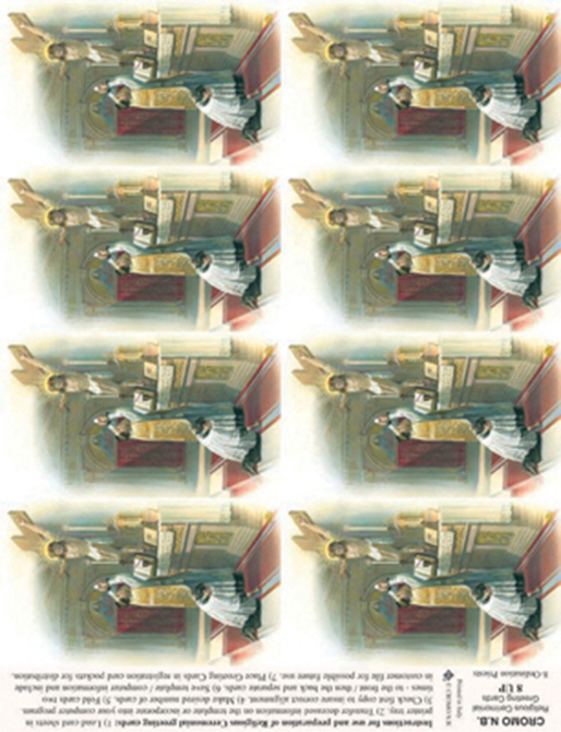 Full color paper holy cards on a sheet with custom imprint of your choice on back.. Micro-perforated to easily detach. Submit by fax or email the message or prayer you want to be printed on the back of the cards. A proof of the exact text will be provided for your approval and signature. 8 cards per sheet. Minimum amount to imprint 3 sheets or 24 holy cards. 8-1/2" x 10", individual card size 2 1/2" x 4 1/4