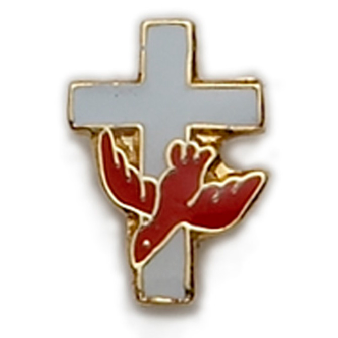 White cross and red descending dove with gold outline and clutch back. 0-1/2" height. Carded.