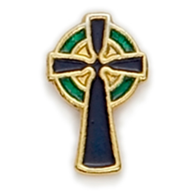 Blue cross and green outer ring with gold outline and clutch back. 0-5/8" height. Carded.