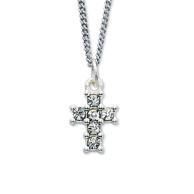 Crystal cross on 16" rhodium plated chain. Boxed.
