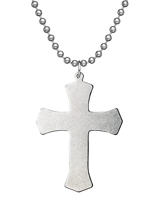 Precision carved out of non-magnetic, non-reactive, brite finished, 100% 304 stainless steel. 24" stainless steel beaded chain. 1-1/2" tall x 1-1/8" wide x 3/32" thick.