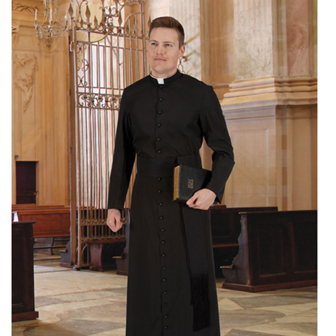 Summertime roman cassock, 65% polyester-35% cotton broadcloth. Tailored with button front, full cuffs, roman back center and two side pleats with concealed slit openings to pants pockets. Shown with optional sash style cincture.