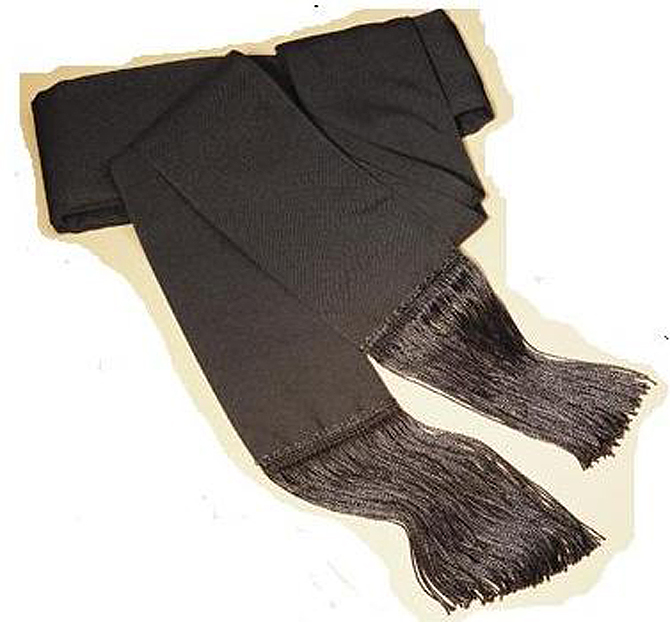 Band cincture 3-1/2" wide in midweight 100% woven poly. Snap closure, double drop panels with fringed ends.