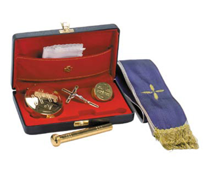 Sick Call Set. 6 inch x 3-1/2 inch x 1-1/2 inch hard case. 2-1/8 inch diameter pyx (7 host capacity), 1 inch diameter oil stock with ring, 3-5/8 inch sprinkler, all gold plated. Crucifix, 65 inch reversible stole, two cloths.