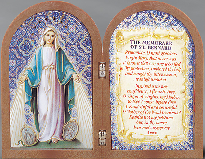 Gold foil embossed picture and prayer, imported, on a wood tone standing diptych plaque. 3-3/4" x 4-3/4".