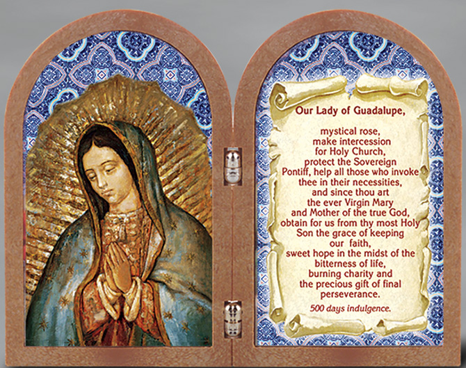 Gold embossed natural wood Our Lady of Guadalupe standing diptych with prayer. Diptych size: 5" x 3 1/2" Made in Hungary. Polybag.