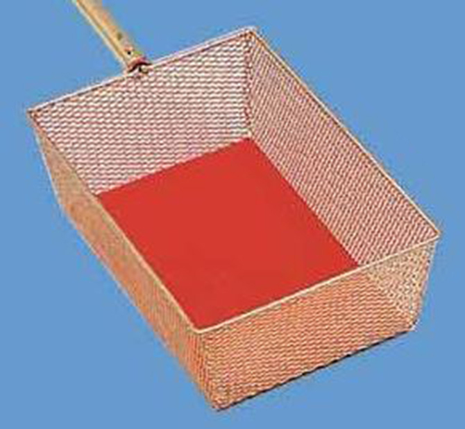 Collection Basket. With felt liner. Telescoping handle extends 45 inch to 66 inch. Basket is 8 inch x 12 inch x 4 inch deep. Brass plated.