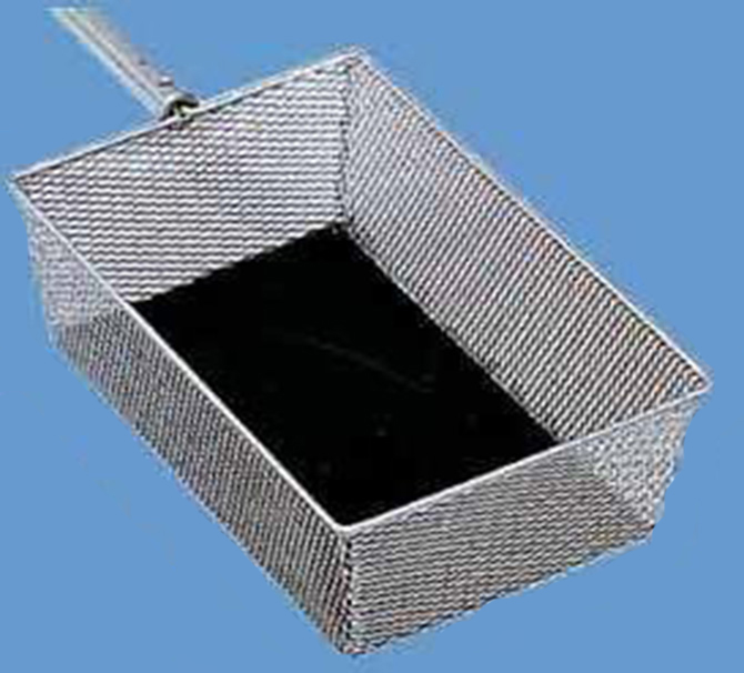 Collection Basket. With felt liner. 3 foot rigid handle. Basket is 8 inch x 12 inch x 4 inch deep. Nickel plated.
