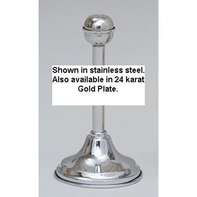Holy Water Sprinkler with Stand. Reservoir type. 10 inch long, 2 ounce capacity sprinkler. 2-1/2 inch high, 5-1/4 inch diameter stand. 24 karat gold plated.