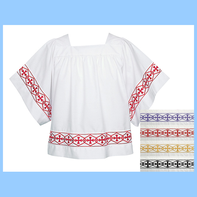 Square yoke banded surplice, 65% polyester/35% cotton. Cross design available in purple, green, blue, gold, red and black. Special order only. Please specify color in comment on check-out.