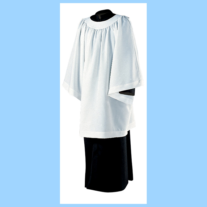 Shown with Altar Server Cassock number 215 (sold separately), This round yoke surplice is made of 65% Polyester and 35% Cotton. Wrist length sleeves.