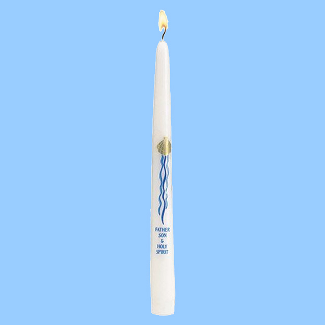 Baptism candle made of stearine wax with blue decoration of flowing water from a gold colored baptismal shell with the wording "Father, Son & Holy Spirit". Individually boxed. 10 inches tall x 0-7/8 inches in diameter. Sold per piece, case of 24