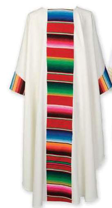 Soft, fully machine washable wrinkle resistant polyester chasuble in off-white color. Each is a full 60" wide and 52" long. Embroidery on front and back. Matching lined under stole is included. Latino motif banding.