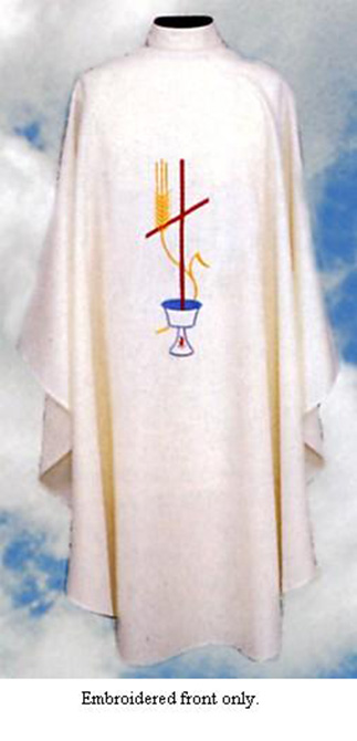 Ample ( 60" W. x 52" L. ) embroidered front only, available in all liturgical colors made of polyester-linen weave. Available with 3-1/2" roll collar for an additional cost. Beautiful multicolor self lined stole included.