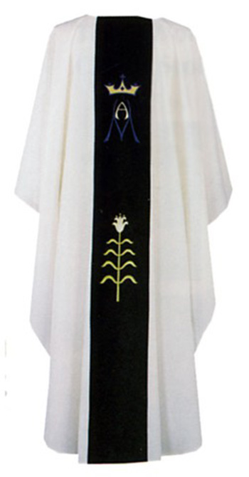 Ample ( 60" wide x 52" long ) front and back multicolor embroidery on 6" velvet band with Marian design. Matching under stole included, made of wrinkle resistant polyester.