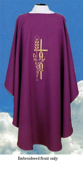Ample ( 60" W. x 52" L. ) embroidered front only, available in all liturgical colors made of polyester-linen weave. Available with 3-1/2" roll collar for an additional cost. Beautiful multicolor self lined stole included.