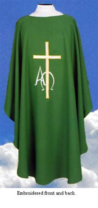 Ample ( 60" W. x 52" L. ) embroidered front and back, available in all liturgical colors made of polyester-linen weave. Available with 3-1/2" roll collar for an additional cost. Beautiful multicolor self lined stole included.