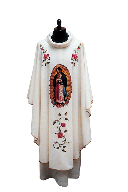 45% wool 55% poly fabric in off white color. Features an image of Our Lady of Guadalupe in the center with depictions of roses on vines above and below the design. Chasuble measures 63" across, 51" long.