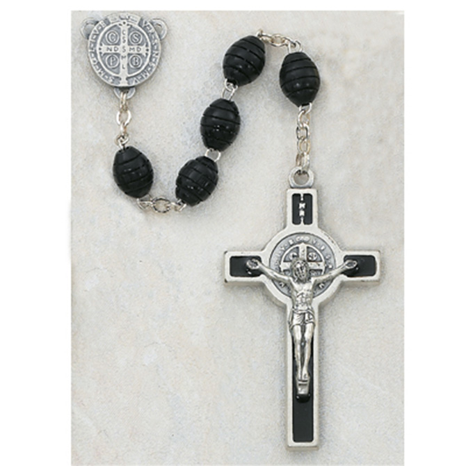 21-1/2" Length. 6 x 8mm Black Carved Wood with St Benedict medal centerpiece and St Benedict Crucifix. Boxed