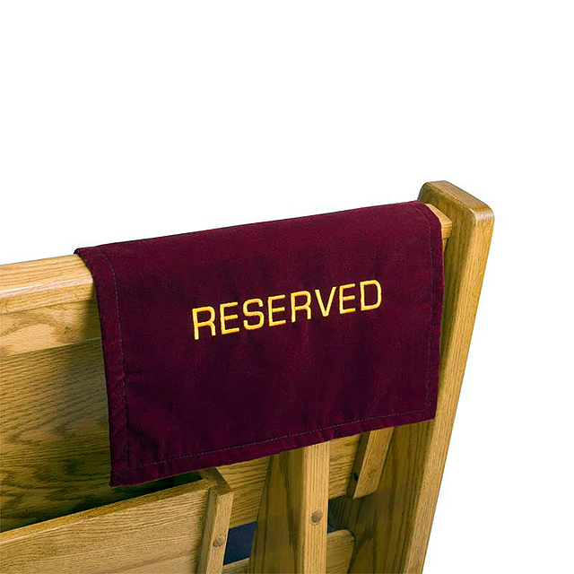 Pew Reservation Marker. Simply drops over the back of any pew or chapel chair. Made of high quality maroon velvet with non-skid back. 13-1/2" x 17" with the word RESERVED embroidered in 1" gold letters on both front and back. This reserved sign fits all pews and church chairs. Quick and easy to display, move and store. (No other wording or color available).
