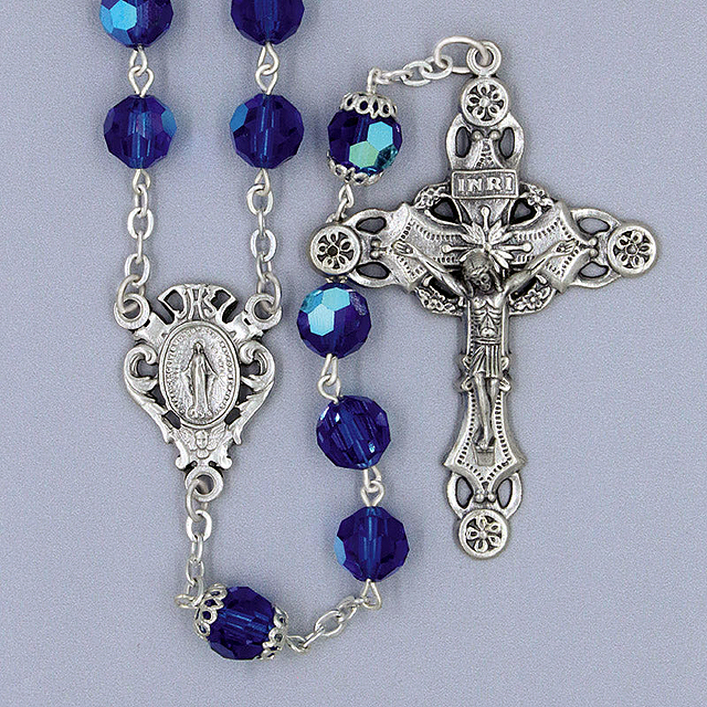 Rosary made from 6mm Bohemian tin cut aurora borealis Capri Blue beads with deluxe crucifix and center. 20" Long. **Crucifix and center may not be as pictured. It is subject to whatever the factory has available. Please call or email us and we can send you a picture of the current style.