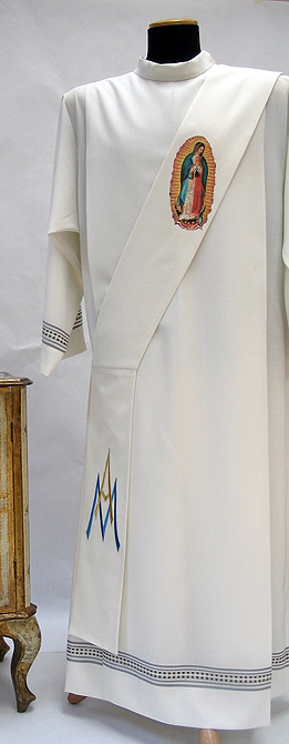 Guadalupe Deacon Stole in Primavera fabric (100% polyester), with printed picture and Marian symbol embroidered.