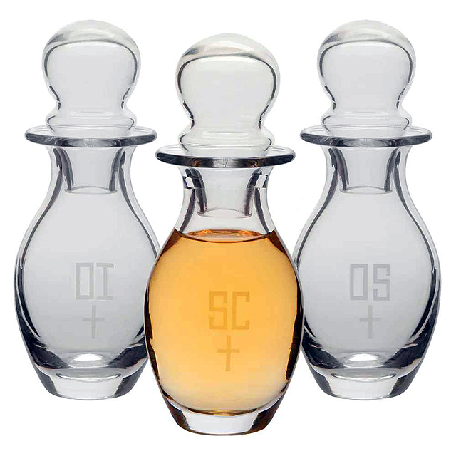 3-Piece Glass Chrismal Set6-3/8" Height 6 oz. Capacity"OI", "OS" & "SC" Etching on Bottles with Cross Accent