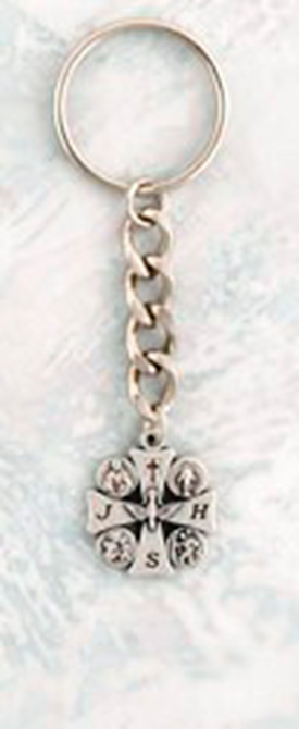 Oxidized 4-Way medal with Sacred Heart, Miraculous Medal, St Joseph, and St Christopher with the Holy Spirit on the middle of the cross key chain.