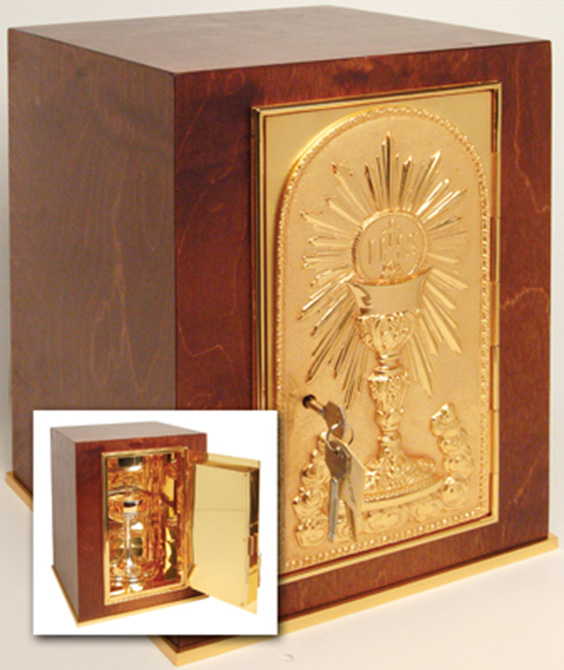 Tabernacle. Wood with 24 karat gold plate door, base frame and interior. 24 karat bright gold plated inside. 17 inch high x 11-7/8 inch wide x 11-7/8 inch deep. Door opening: 13 inch high x 6-1/2 inch wide. Wt. 35 pounds.