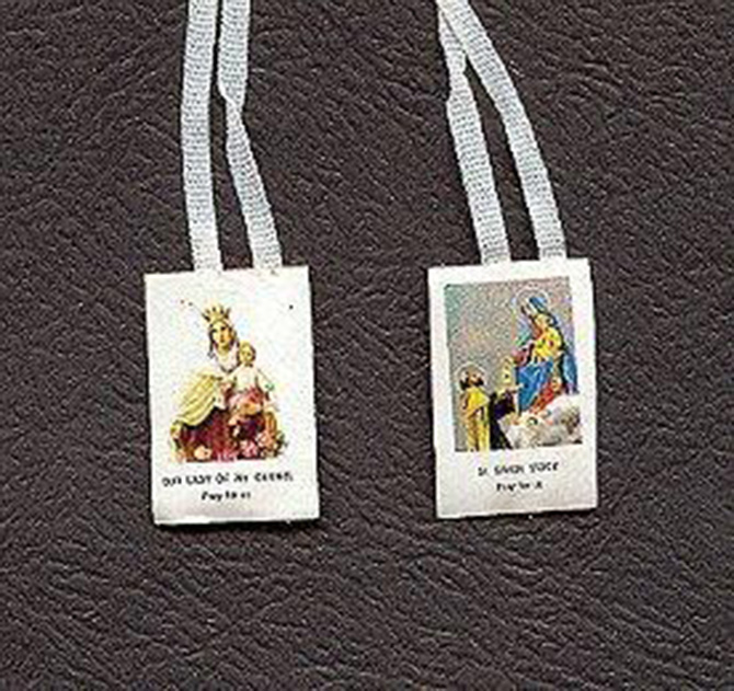 Our Lady of Mt Carmel on one side and Our of Mt Carmel with St Simon on the reverse side. Full color, not laminated. White ribbon. Each in a cellophane bag.