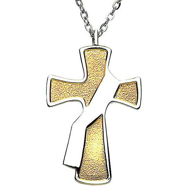 2 1/2" two-toned nickel and gold plated cross on 28" gold tone chain. Gift boxed.