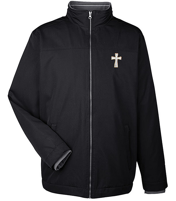 Jacket in black microfiber with embroidered clergy cross. 89% poly, 11% microfiber, two inside pockets, water repellent.. Sizes small, medium, large, extra large. 2XL to 4 XL sizes available at extra cost