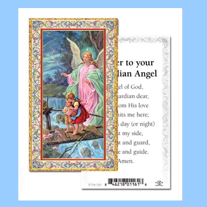 Guardian Angel (Angel of God) paper holy card that measures 2-1/4 inch x 4 inch . Gold embossed Italian card that comes with prayer on the back and printed on heavy cardstock. Sold in packs of 100 only.