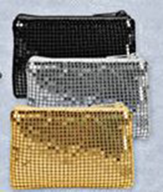 Metal mesh purse with anti-tarnish lining. 3-1/2" x 3-1/2". Zipper closure.