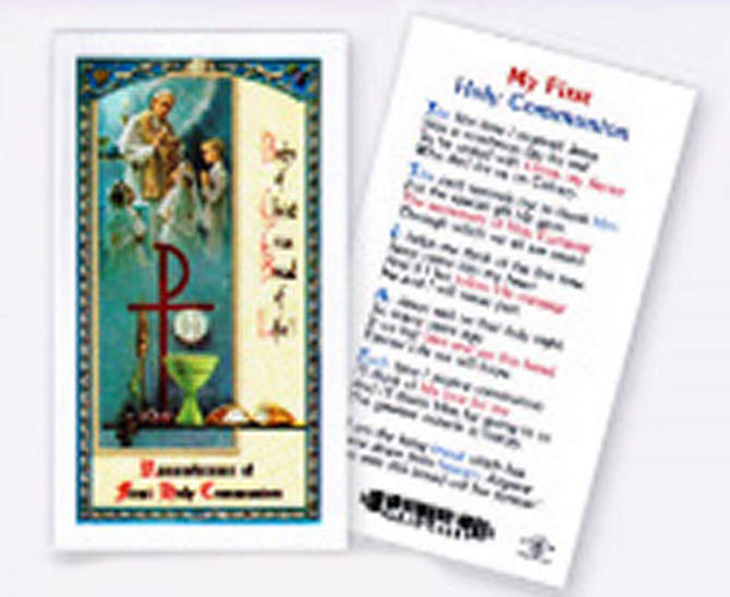 Full color laminated First Communion Holy Cards with prayers on reverse. 2-1/2" x 4-1/2".