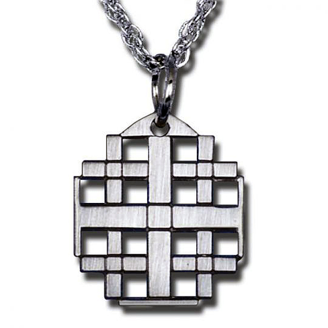 Jerusalem Cross pendant made from solid cast antiqued and polished pewter, 0-3/4" medal on an 18" chain, gift boxed.