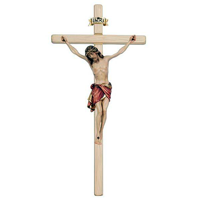 Genuine Wood carved Cross with fiberglass corpus. When ordering please specify sash color (Red, White or Blue), Cross color (Stained or Natural) and Cross shape (Straight or Bent)
