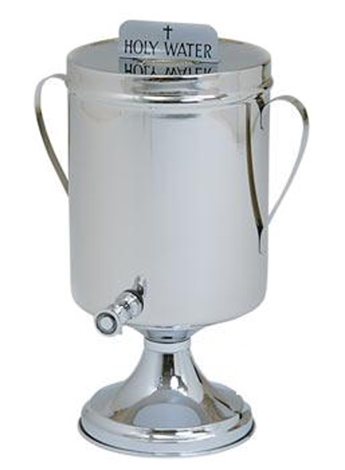 Stainless steel without handles, 2 gallon capacity, 15" height, 7" base. Available with either Baptismal Water or Holy Water sign, Please specify when ordering.