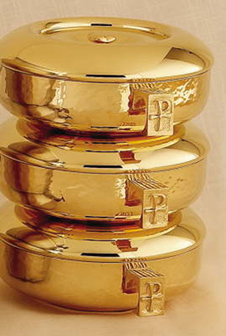 Triple stacking ciboria. Overall height 9", bowl 6" diameter, host capacity 1050. (Host capacity based on 1-1/8" host.)