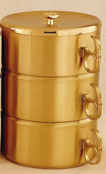 Triple stacking ciboria, made of brass, satin finished gold plate. Overall height 8", host capacity 750. (Host capacity based on 1-3/8" host.)