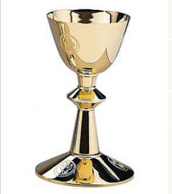 Brass gold plated cup with engraved symbols of the Three Virtues. Base features symbols Lamb, Px and Dove.