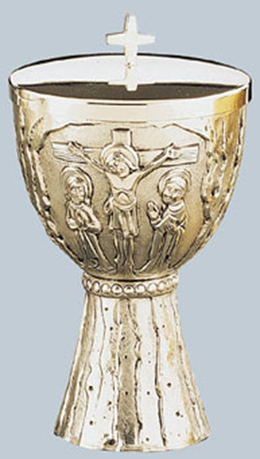 Brass silver plated, gold lined, deeply tooled Crucifixion scene. 7" high, 4" cup diameter.