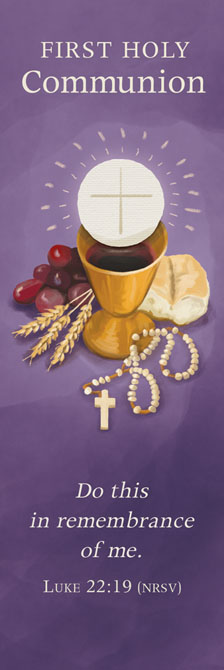 Matching full-color bookmark on die-cut card stock with First Communion theme design and prayer on the back. Sold in packs of 25. 2" x 6-1/2"