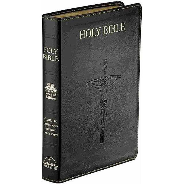 Catholic Companion Edition "Librosario Decade" Silk ribbon marker. Deluxe gift box. New American Bible Revised Edition with revised New Testament and Psalms. Features include: Presentation Page; Dogmatic Constitution on Divine Revelation; Origin, Inspiration and History of the Bible; Three Year Cycle of Readings; Celebration of the Eucharist; The Succession of Popes; encyclopedic dictionary and page-edge indexing. 5-3/4" x 8-1/2". Black cover, gold edges.
