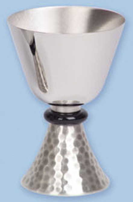 Chalice. Stainless steel cup with black delrin node. Silver plated hammered finish on base. 5-5/8 inch high, 3-3/4 inch diameter cup, 3 inch base, 8 ounce capacity.