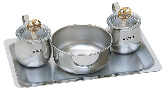 Cruet Set. All stainless steel, 24 karat gold plated cross on clear cover; 5 ounce, 4-1/4 inch bowl, 6-1/2 inch x 10 inch tray.